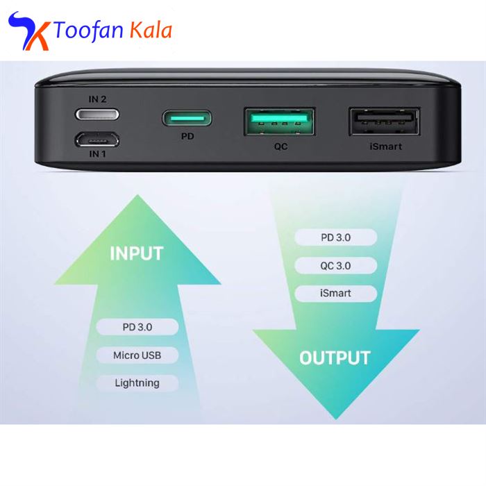 دارای دو درگاه شارژ ورودی microUSB و لایتنینگ دارای درگاه USB-C مجهز به فناوری PD با امکان استفاده به صورت ورودی و خروجی و توان 18 وات دارای درگاه خروجی USB مجهز به فناوری شارژر هوشمند iSmart دارای درگاه خروجی USB مجهز به فناوری شارژ سریع QC دارای بدنه مستحکم و مقاوم در برابر سرخوردن و خط و خش |