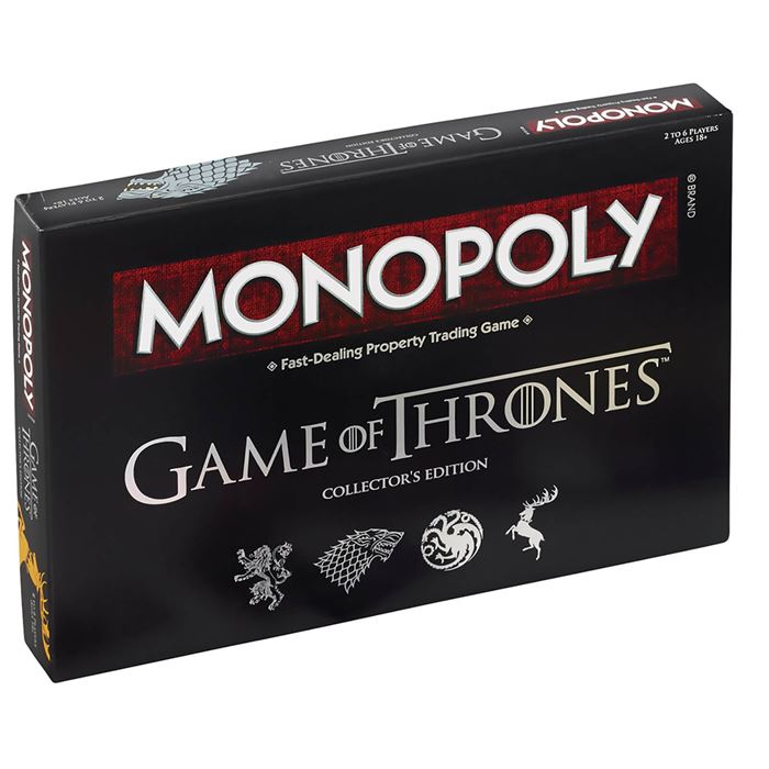 یک بازی سفارشی همه جانبه با آیتم های انحصاری کارتهای سنتی MONOPOLY “Chance” و “Community Chest” به کارتهای “Valar Morghulis” و “Thron Iron” تبدیل می شوند هواداران از باز کردن جعبه بسته بندی شده کاغذی مشکی ظریف با سیلیکون های فوم نقره ای مهر و موم شده از جمله لانیستر ، استارک ، تارگرین و باراتون لذت می برند. خانه ها و هتل های سنتی به دهکده های سفارشی و نگهدارنده تبدیل می شوند. |