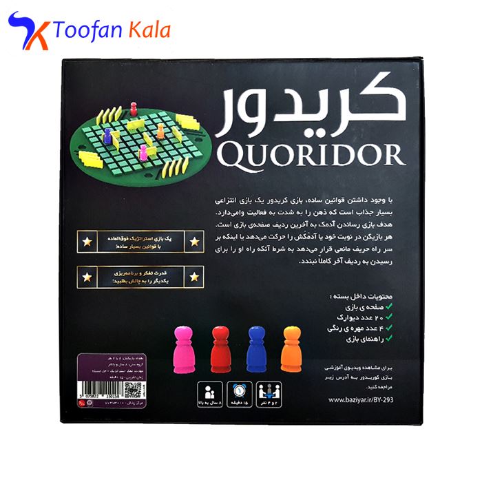 بازی استراتژیکی مشهور و بین المللی با قواعد ساده و در عین حال تکنیکهای جذاب میباشد. یک بُردگیم خوب فکری و استراتژیک با قوانینی ساده، که اگر آن را به صورت چهارنفره تجربه کنید، بیشک به یکی از هیجانانگیزترین بازیهای فکری عمرتان بدل میشود. در ابتدای بازی کریدور بازیکنان آدمک خود را در خانه وسط ردیف اول سمت خود قرار میدهند. هر بازیکن میتواند در نوبت خود یا آدمک خود را حرکت دهد ( یک خانه افقی یا عمودی ) و یا یک مانع در صفحه قرار دهد و مسیر حرکت را مسدود کند . باید توجه داشت که نمیتوان مسیر حریف رابه کلی بست و حداقل یک راه برای رسیدن به انتهای صفحه برای بازیکنان باد باز بماند. بازیکنی که بتواند زودتر آدمک خود را به طرف دیگر صفحه بازی برساند ، برنده است . بازی را میتوان با ۲ یا ۴ بازیکن انجام داد . تقویت قدرت برنامه ریزی و تصمیم گیری،آموزش مهارت حل مساله و پرورش تفکر استراتژیک از اهداف این بازی به شمار میرود.