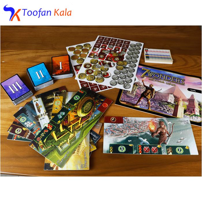 در بازی 7wonders شما رهبر یکی از 7 شهر مهم تمدنهای باستانی را بر عهده دارید. در این بازی با جمع آوری منابع، گسترش مسیرهای تجاری و افزایش قدرت نظامی سعی میکنید بر رقیبان خود پیروز شوید. بازی 7wonders در 3 دوره اتفاق میافتد و در هر دوره 7 کارت در اختیار بازیکنها قرار میگیرد. هر بازیکن از 7 کارتی که در دست وی قرار دارد، یکی را انتخاب میکند و مابقی را در اختیار بازیکن بعدی قرار میدهد. در طول بازی، بازیکنان کارت هایی که در دست خود دارند را بازی میکنند و بسته به اینکه چه کارتی را بازی کنند، منابعی به دست میآورند یا با بازیکنان دیگر وارد معاملاتی میشوند. هر بازیکن صفحه ای در اختیار دارد که از آن برای دسته بندی کارتها یا مشخص کردن قدرتهای خود استفاده میکند. این نسخه در ایران تولید شده است و از کیفیت بالایی برخوردار است. دفترچه راهنمای فارسی با کیفیت خیلی خوبی در جعبه قرار داده شده است. همچنین کیفیت جعبه، توکنها و صفحههای بازیکنان بسیار بالاست. کارتهای بازی کاملا ترجمه شده است و از کیفیت خوبی برخوردار است.