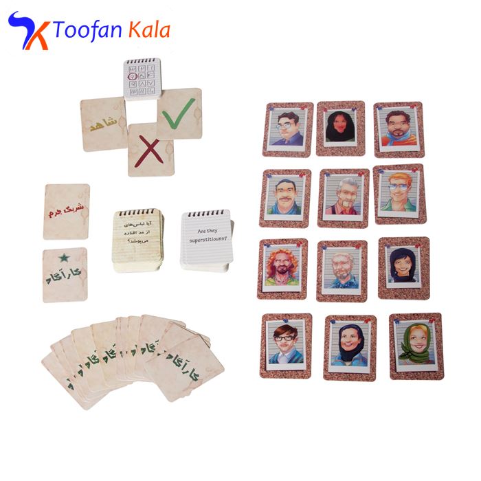 -کارت سوال -کارت نشانگر مجرم -کارت کاراگاه و کارت جاسوس -یک کارت بله و یک کارت خیر -دفترچه راهنمای بازی |