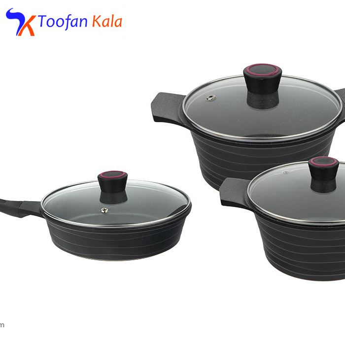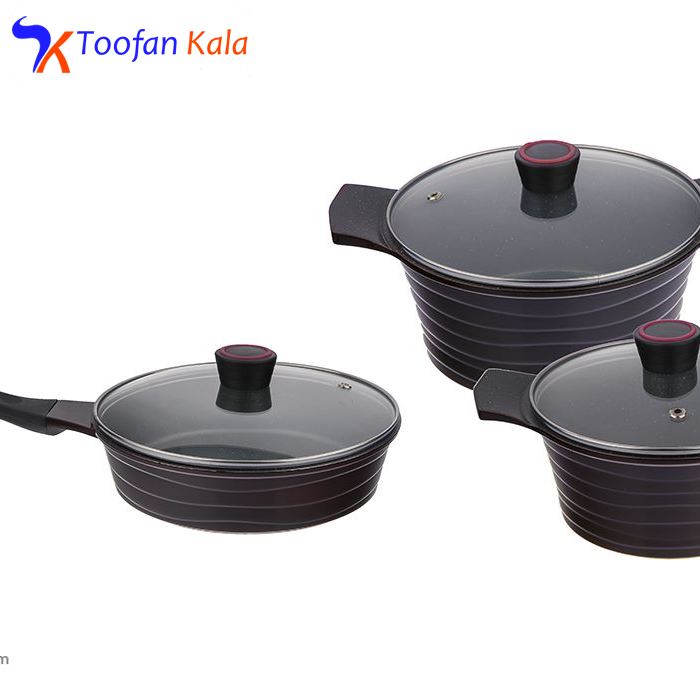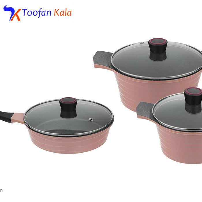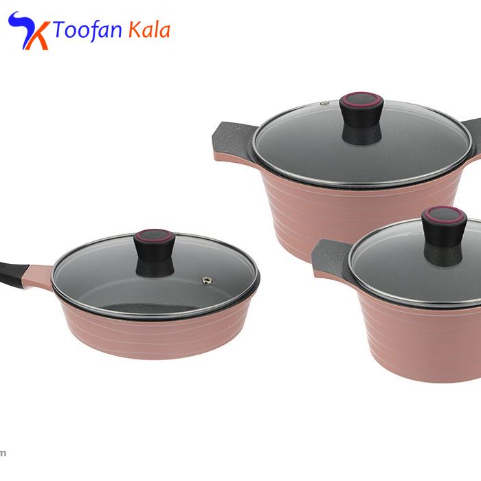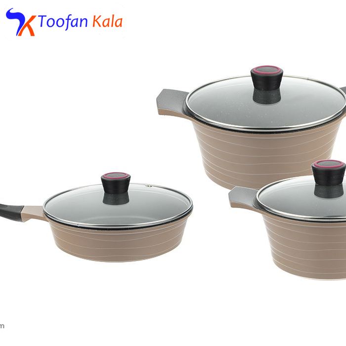 سرویس پخت 6 پارچهی «تکنو» مدل دریا با داشتن ظروفی جمعوجور و اقلامی بسیار مختصر ولی کاربردی برای خانوادههای دو تا چهارنفر مناسب خواهد بود. حتی اگر برای نوعروسان بهدنبال یک سرویس پخت هستید که بهطور روزمره مورد استفاده واقع شود، این مدل را به شما پیشنهاد میکنیم. سرویس پخت تکنو از بدنهی آلومینیوم با روکش گرانیت ساخته شده است که امکان پخت غذایی سالم و بیضرر را برای خانواده فراهم میکند. فقط در رابطه با این ظروف باید نکتههایی را مدنظر داشته باشید که در نگهداری هرچهبهتر آنها به شما کمک میکنند. اولین نکته استفادهنکردن از قابلمهها و تابه روی حرارت بسیار زیاد، بدون وجود موادغذایی یا روغن است؛ زیرا باعث سوختن ظروف میشود. درپوشهای این سرویس از شیشه هستند و میتوانید در حین پخت غذا محتویات ظرف را هم ببینید.