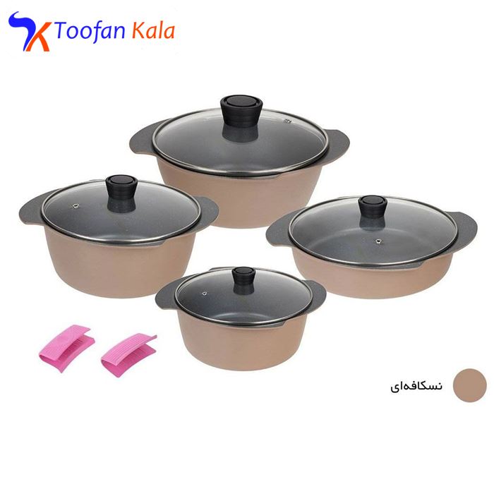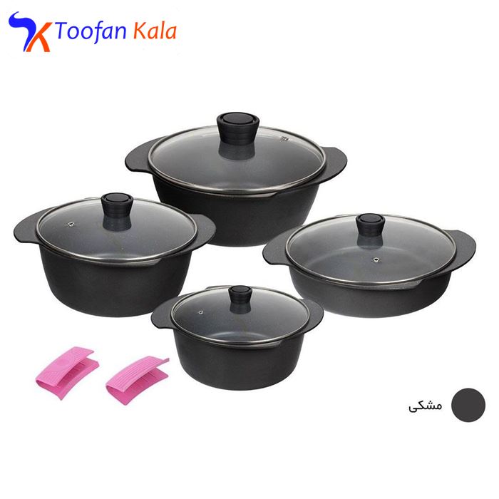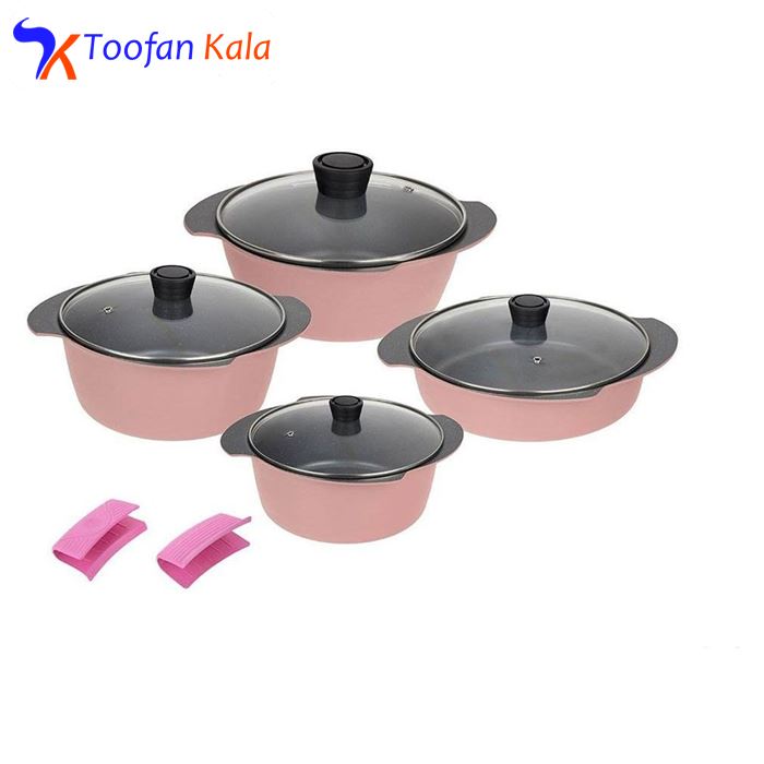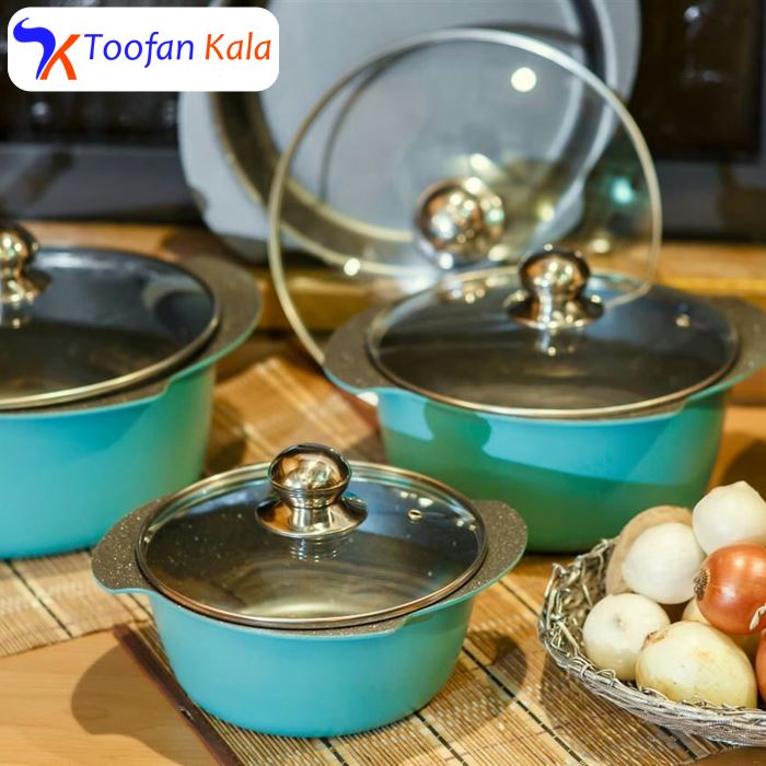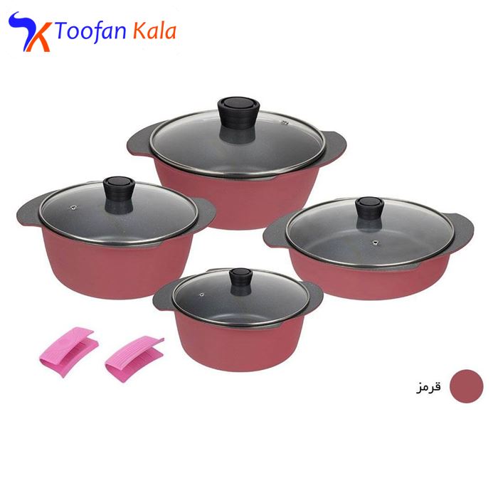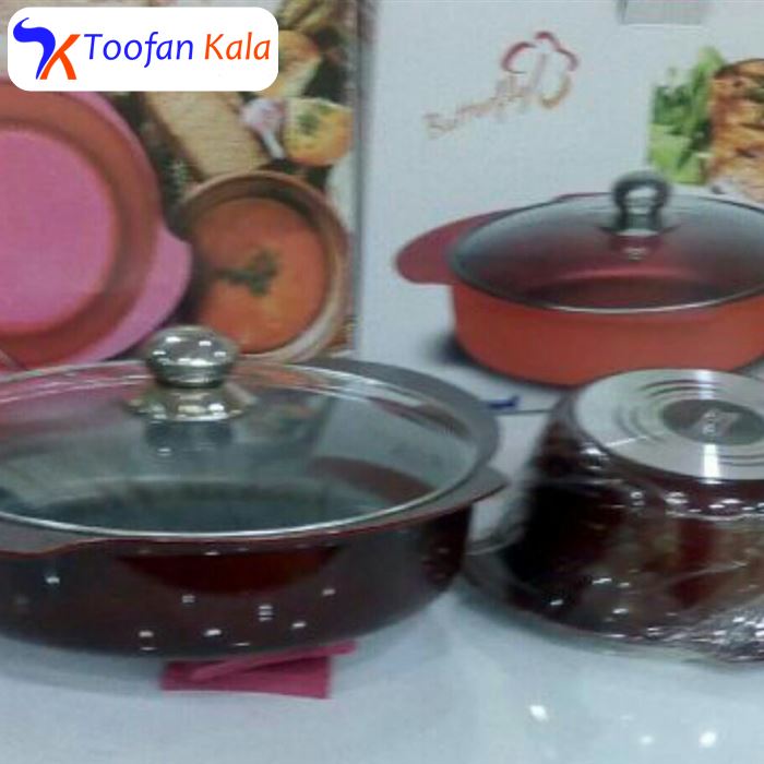 - سه عدد قابلمه، یک تابه و دستگیره سیلیکونی - دارای درپوشهای شیشهای با رینگ استیل - قابلمه سایز 28: - ابعاد: طول 37، عرض 33، ارتفاع 12 سانتیمتر - وزن: 1810 گرم - قابلمه سایز 24: - ابعاد: طول 32، عرض 28، ارتفاع 10.5 سانتیمتر - وزن: 1360 گرم - قابلمه سایز 20: - ابعاد: طول 26، عرض 23، ارتفاع 8 سانتیمتر - وزن: 910 گرم - تابه سایز 28: - ابعاد: طول 37، عرض 33، ارتفاع 7 سانتیمتر - وزن: 1625 گرم - دارای دو عدد دستگیره سیلیکونی - ابعاد: طول 8 و عرض 4 سانتیمتر |