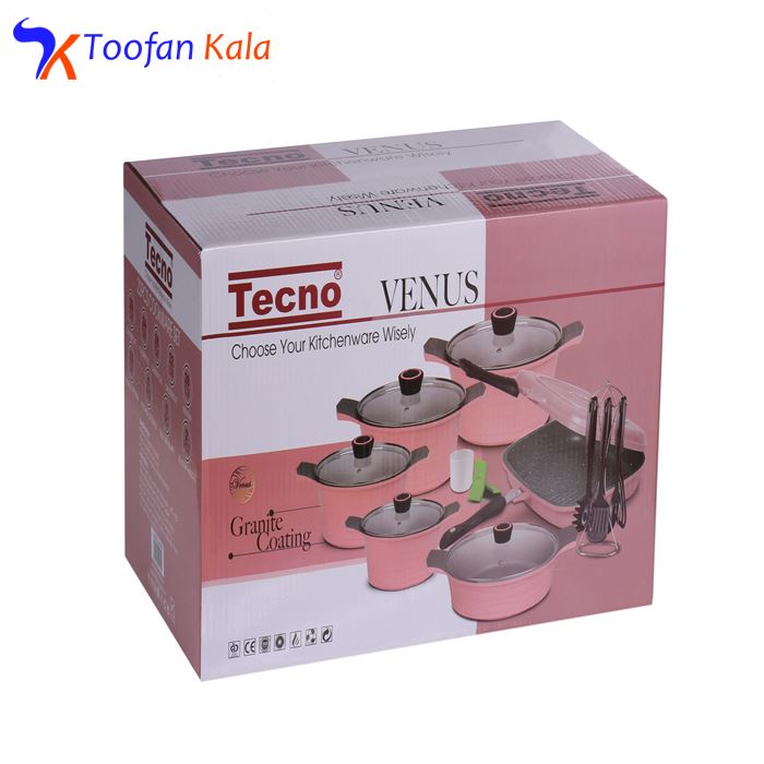 سرویس قابلمه چدن از جمله وسایلی است که مورد استفاده هر روزه است و به دلیل تماس مکرر با حرارت و شستشو، باید جنس مقاومی داشته باشد . سرویس پخت و پز 22 پارچه تکنو مدل ونوس شامل چهار عدد قابلمه سایز 20 ، 24 ، 28 و 32 سانتیمتر و یک عدد تابه سایز 28 و یک تابه رژیمی سایز 33 به همراه ست کفگیر ملاقه ، یک جفت دستگیره سیلیکونی و یک پیمانه مدرج است. تمامی ظروف این سرویس دارای درپوش بوده که این دربها از شیشه ساخته شده و دارای یک رینگ استیل هستند. روی هر کدام از درپوشها یک سوپاپ خروج بخار با جنس استیل زد زنگ تعبیه شده که کمک میکند تا بخار اضافی به خوبی از ظرف خارج شود. قپههای سرویس تکنو از جنس باکالیت نسوز است که در برابر حرارت مقاوم هستند و دارای رینگ سیلیکونی جهت زیبایی هستند . بدنهی این سرویس از آلومینیوم الیاژی انتخاب شده و روکش داخلی آن گرانیت است. خیلی از افراد تمایل دارند ظروف پخت خود را در فر قرار دهند؛ اما مشخص است که همهی ظروف این قابلیت را ندارند و باید از ظروفی استفاده کنید که دستههایی از جنس بدنه داشته باشند. شکوه طراحی در این سرویس زیبایی آشپزخانهی شما را افزون میکند