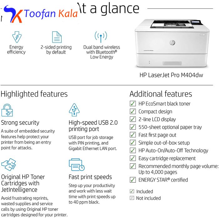 پرینتر لیزری «LaserJet Pro M404dw» محصولی از شرکت محبوب «اچ پی» (HP) است. این دستگاه پرینتر کاربری تککاره بوده و چاپ تکرنگ دارد. مدل LaserJet Pro M404dw با ظرفیت سینی استاندارد 250 برگی و 100 برگی چند منظوره، برای محیطهای با حجم کاری متوسط گزینهای ایدئال محسوب میشود. بنا بر ادعای شرکت HP، این پرینتر لیزری سرعت چاپی تا 40 برگ در دقیقه دارد؛ با این میزان سرعت، میتوانید حجم زیادی از امورات را در کوتاهترین زمان ممکن به اتمام برسانید. البته به یاد داشته باشید که سرعت چاپ زیاد یکی از مشخصههای اصلی پرینترهای لیزری بهشمار میرود. از سوی دیگر، رزولوشن چاپی این پرینتر لیزری با فناوری HP FastRes به 1200 dpi میرسد. بنابراین میتوان گفت، مدل LaserJet Pro M404dw نهتنها سرعت، بلکه کیفیت را نیز در دستور کار دارد. این محصول میتواند ماهانه حداکثر تا 80,000 برگ به چاپ برساند که البته میزان استفاده ماهانه توصیه شده توسط سازنده بین 750 تا 4000 برگ میباشد.نکتهی قوت این دستگاه، قابلیت چاپ دوروی آن است؛ با این ویژگی دیگر نیازی به پشتو رو کردن دستی کاغذها نیست. USB، شبکه و اتصال بیسیم تشکیلدهندهی مجموعهی اتصالات پرینتر لیزری LaserJet Pro M404dw هستند. همچنین از امکانات مضاعف این پرینتر میتوان به قابلیت میزبانی USB و دارا بودن مزیت دو باند جداگانه ٌWiFi و Wireless جهت اتصال اشاره کرد .