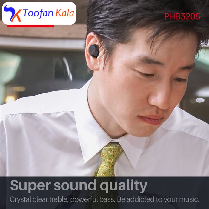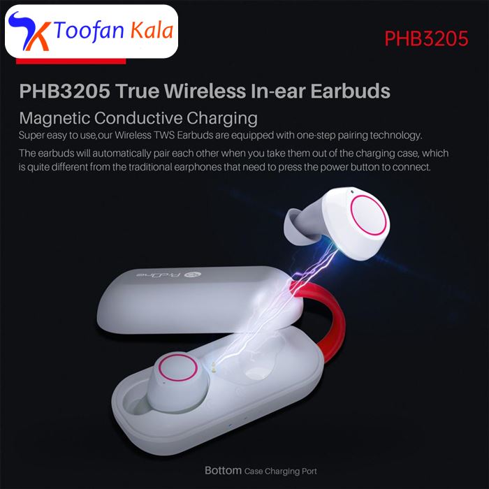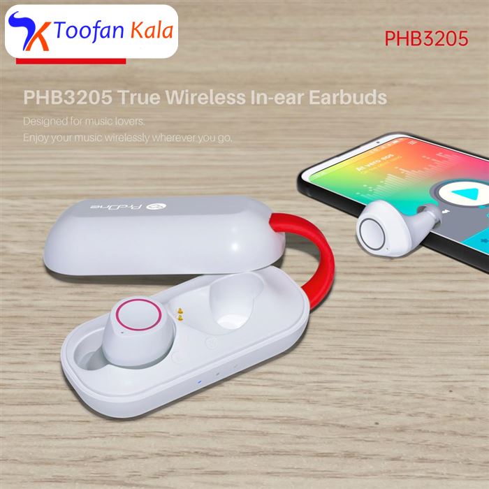 هندزفری PHB3205 دارای دو گوشی با فناوری TWS است که درون یک محفظه قابل شارژ قرار دارند.محفظه شارژر دارای ظرفیت باتری معادل 240 میلی آمپر است که میتواند 2 بار به صورت کامل هر دو گوشیها را شارژ کند.