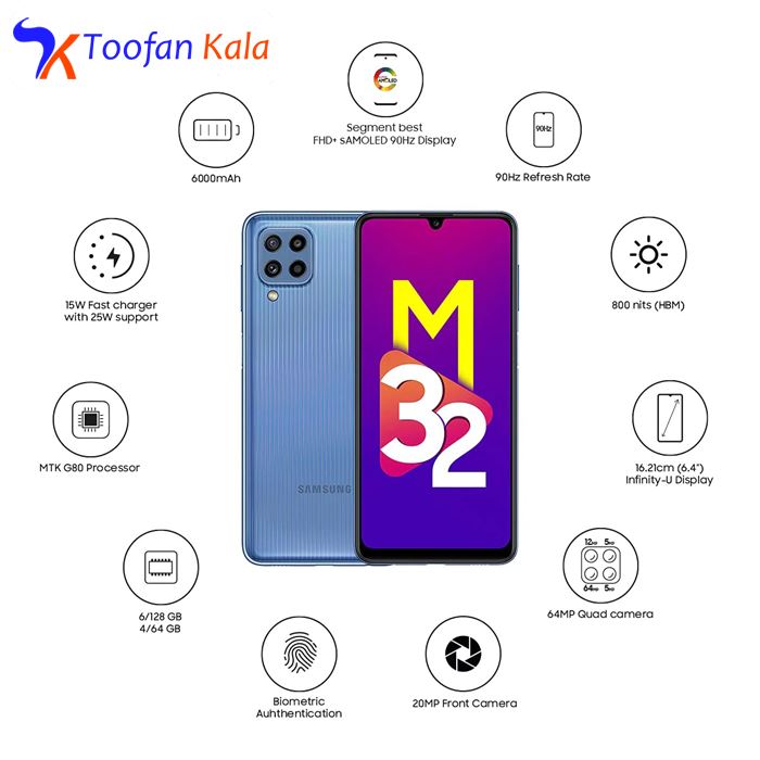 سامسونگ Galaxy M32 یکی از گوشیهای هوشمند میانرده این شرکت است که با توجه به بهره بردن از مشخصات فنی مناسب، میتواند عملکرد بسیار خوب و قابل قبولی داشته باشد. در برخی از موارد، مشخصات در نظر گرفته شده برای این گوشی هوشمند میانرده، دست کمی از یک پرچمدار ندارد. Galaxy M32 به صفحهنمایش با ابعاد 6.4 اینچ و رزولوشن 1080×2400 پیکسل از نوع سوپرامولد مجهز شده است. صفحهنمایش باکیفیتی که توانایی ارائه نرخ بروزرسانی 90 هرتز را دارد. در قسمت پشتی هم چهار سنسور دوربین برای این گوشی هوشمند میانرده در نظر گرفته شده است. یک سنسور دوربین اصلی قدرتمند با رزولوشن 64 مگاپیکسل از نوع عریض با گشودگی دریچه دیافراگم f/1.8 در کنار سنسور 8 مگاپیکسل از نوع فوق عریض (ultra wide) و دو سنسور با رزولوشن 2 مگاپیکسل از نوع ماکرو و سنجش عمق، سنسورهای دوربین چهارگانه Galaxy M32 را تشکیل میدهند. برای دوربین سلفی هم سنسور قدرتمند با رزولوشن 20 مگاپیکسل در نظر گرفته شده است. در بخش مشخصات سختافزاری هم این گوشی به پردازنده میانرده هلیو G80 شرکت مدیاتک (Mediatek Helio G80) مجهز شده است. همانند اکثر گوشیهای هوشمند میانرده سری M، این گوشی هم به باتری قدرتمند با میزان ظرفیت 5000 میلیآمپرساعت در کنار شارژر 25 وات (پشتیبانی از فناوری شارژ سریع) مجهز شده است.