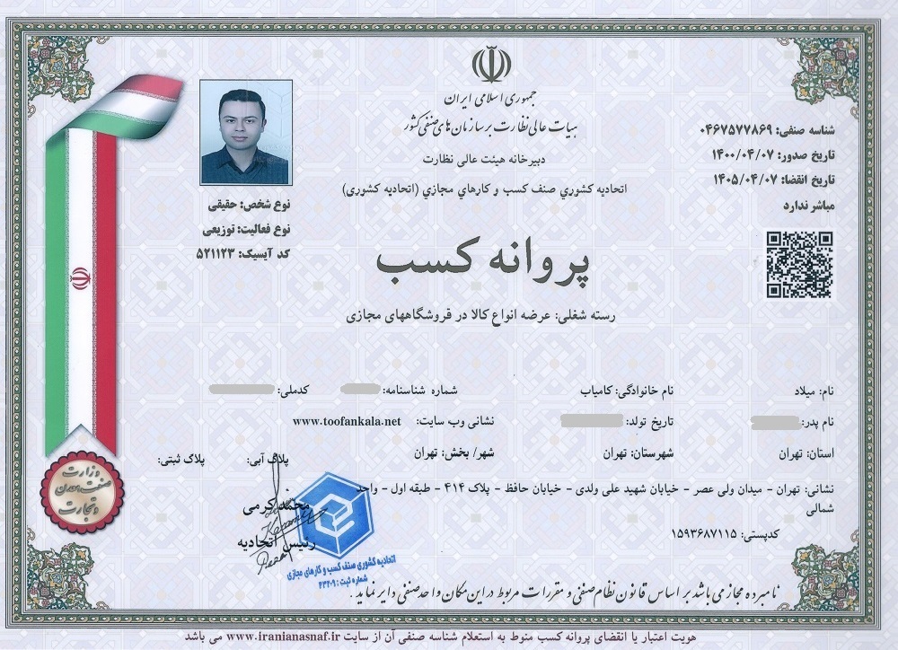 پروانه کسب: جواز یا پروانه کسب به معنای قانونی بودن فعالیت واحد صنفی می باشد و دریافت کننده جواز می بایست نیازها و خواسته های مشتریان و ارباب رجوع ها را براساس قوانین و ضوابط کشوری تامین کند. واحدهای صنفی که جواز کسب دریافت می کنند، برای ارباب رجوع ها قابل اعتمادتر هستند. هر چند شاید کمتر از یک پنجم ِ هزاران فروشگاه اینترنتی که در ایران فعالیت میکنند، جواز کسب نیز دارند. این پروانه کسب پس از طی اعتبارسنجی های مجدد از لحاظ دفتر فیزیکی، وضعیت قانونی حسابهای بانکی، کلاسهای آموزشی ِ متناسب با صنف مورد فعالیت، استعلامات اداره دارایی و... اعطا می شود. طوفان کالا با مجوز کسب فروش انواع کالا در فضای مجازی فعالیت مینماید.