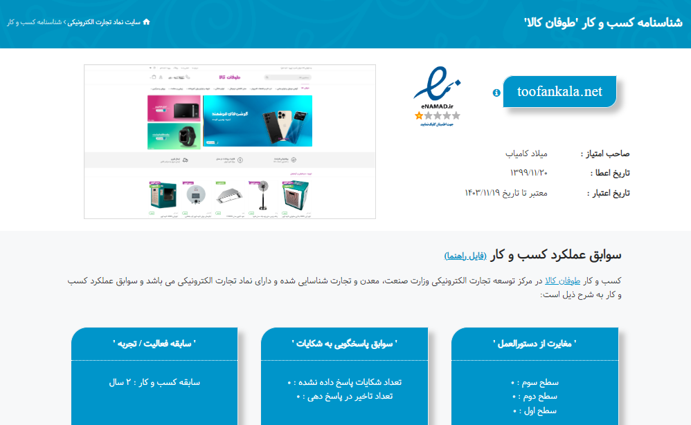 افراد حقیقی و حقوقی ِ دارای اینماد، به دقت احراز هویت و اعتبار سنجی شده اند اعطای این مجوز برای کسب و کارهایی صورت می گیرد که فعالیت شان از نظر مرکز توسعه تجارت الکترونیک قانونی است. طوفان کالا موفق به اخذ نماد اعتماد یک ستاره شده است که با کلیک بر روی نماد در پایین صفحه، جزئیات آن نمایش داده خواهد شد.